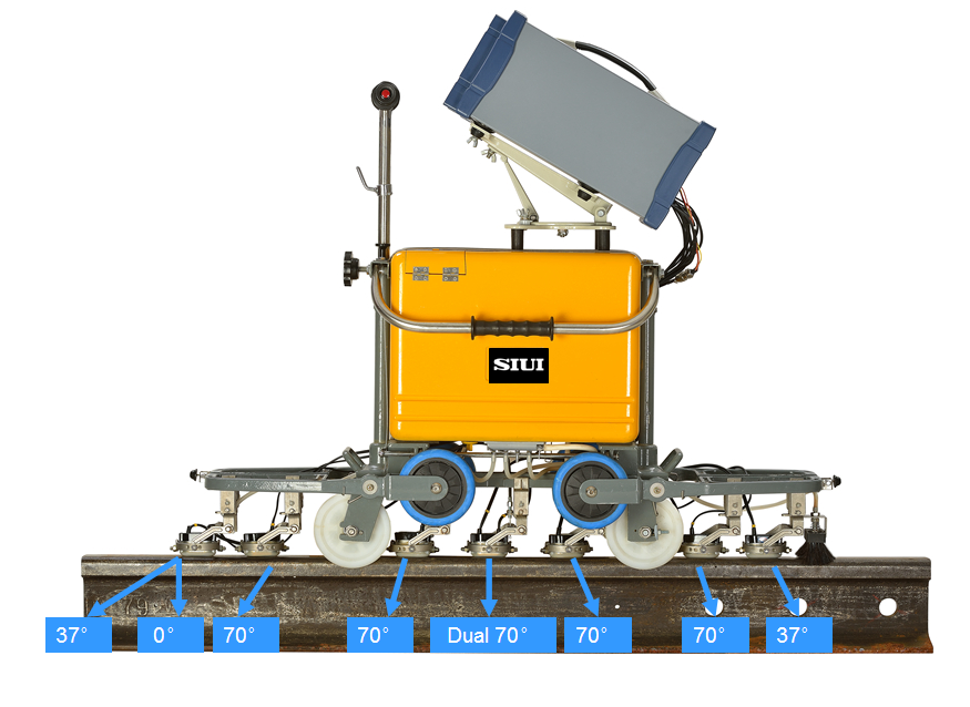 GT-3鋼軌超聲探傷儀是較先進的手推式數字超聲鋼軌檢測儀器。儀器具有全球衛星定位系統(GPS),內置存儲設備全程記錄探傷作業過程,通過SD卡可以將數據輕松導入到電腦中,輕松實現數據管理。 ● 高亮8.4寸TFT顯示屏,陽光下可視; ● 9+1通道配置,增強抗干擾設計,滿足探傷現場各類需求; ● 預置多種軌型探傷設置,并可用戶自定義軌型探傷參數; ● 全程動態A型存儲,可連續存儲6個月以上的探傷數據; ● 全密封防水、防塵設計,適應惡劣環境; ● 智能鋰電池供電,整機可連續工作10小時以上。 產品介紹9個探傷通道 儀器包括9個獨立的探傷通道和1個校準通道,可以實現鋼軌缺陷的檢測、定位等操作。